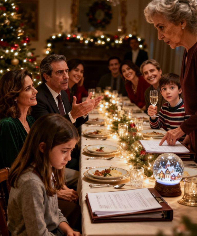 Midden in het kerstdiner hief mijn schoonmoeder haar glas en glimlachte: « Ik ben trots op al mijn kleinkinderen… behalve op één. » Toen wees ze naar mijn negenjarige dochter.