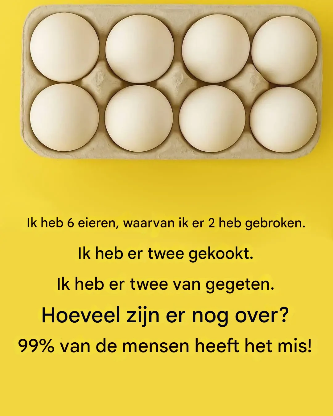 6 eieren, 2 gebroken, 2 gekookt, 2 opgegeten… Hoeveel eieren zijn er nog over? » Deze ogenschijnlijk simpele vraag brengt de meeste mensen in verwarring. Ontdek waarom deze lastige vraag zo goed werkt en test je logica! Houdt dit raadsel je in de val of zet het je aan het denken? Dit ogenschijnlijk simpele probleem heeft … Lire plus