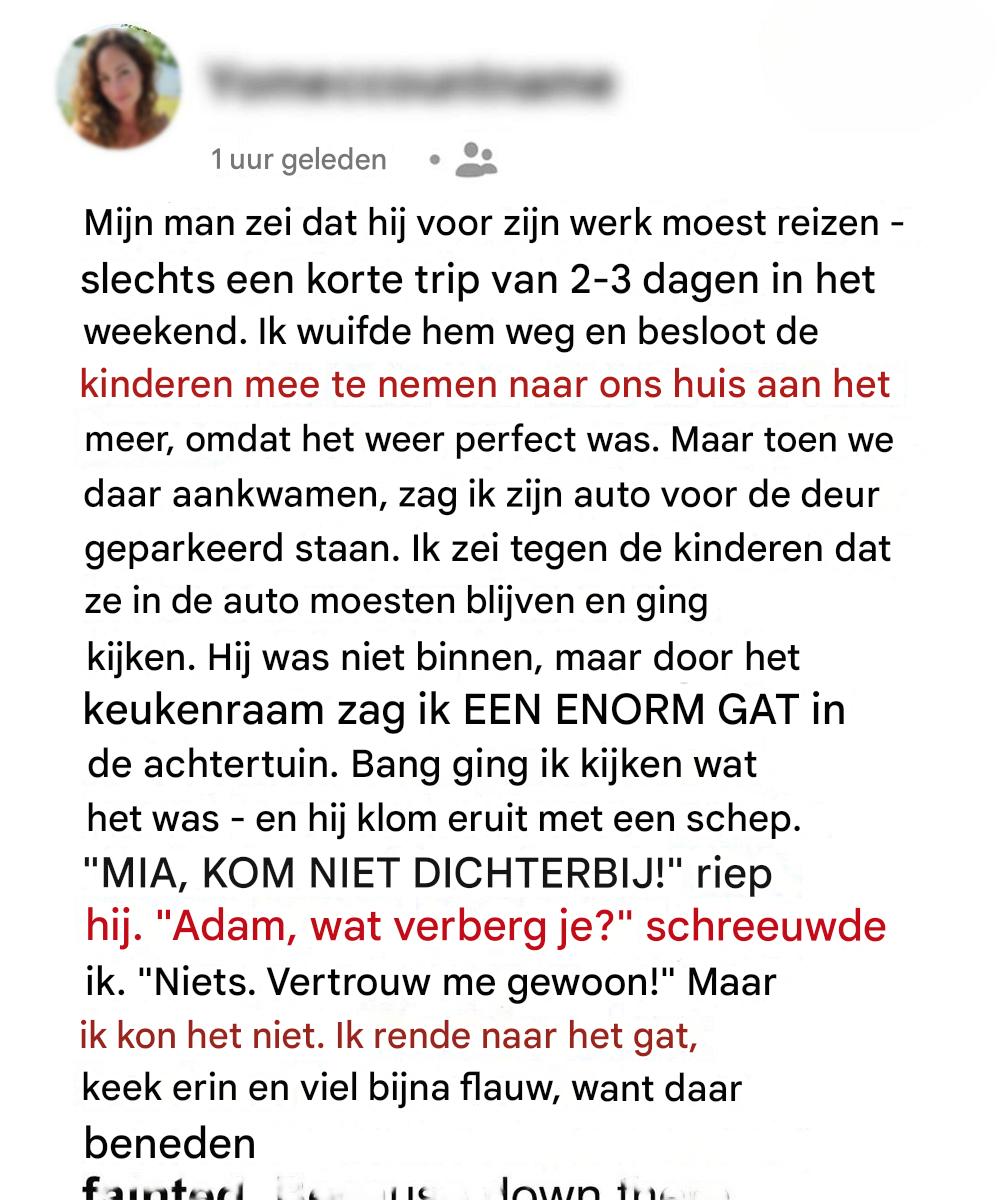 Mia was ervan overtuigd dat haar man Adam op zakenreis was, dus verraste ze haar kinderen met een spontaan bezoek aan het familiehuis aan het meer. Toen ze aankwamen, troffen ze Adams auto echter voor het huis aan. Binnen leek alles normaal, totdat ze een enorm gat in de tuin zag. Toen ze dichterbij kwam, … Lire plus