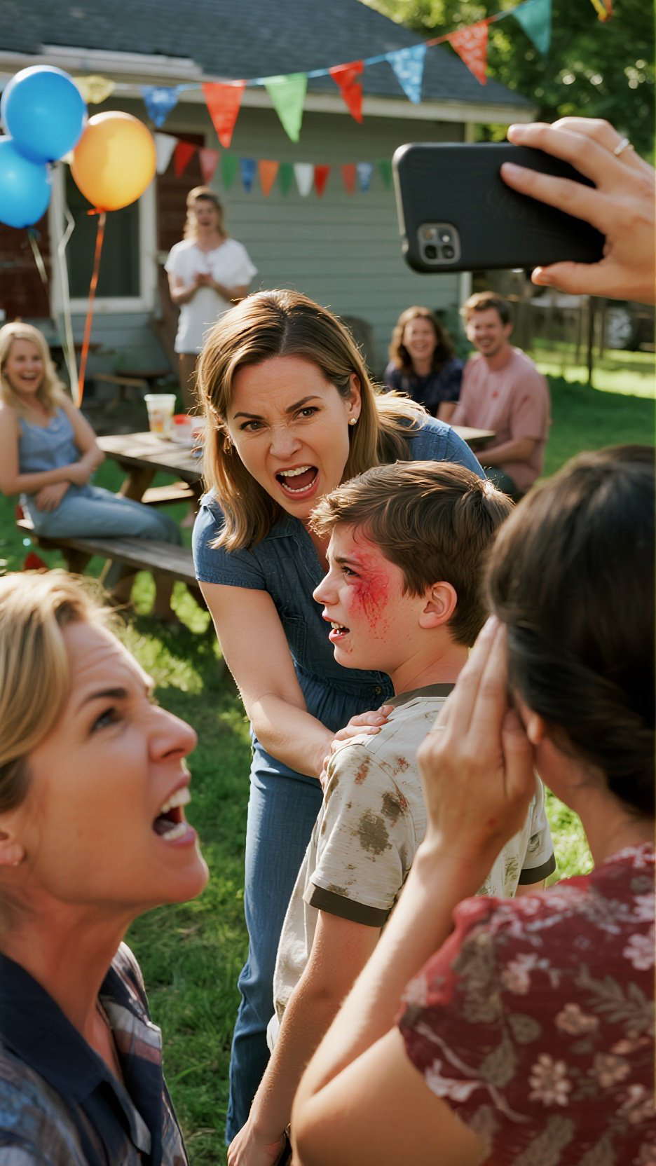 Numa reunião de família, encontrei o meu filho com a cara ferida e manchas de comida na roupa. A minha irmã riu-se e disse: « Vamos lá, é só uma brincadeira ». Não hesitei — dei-lhe uma bofetada forte na cara e fui-me embora. Atrás de mim, a minha mãe gritou: « Como te atreves! », mas na manhã seguinte apareceu à minha porta, a tremer. « Por favor », sussurrou, « dê uma oportunidade à sua irmã de viver ».