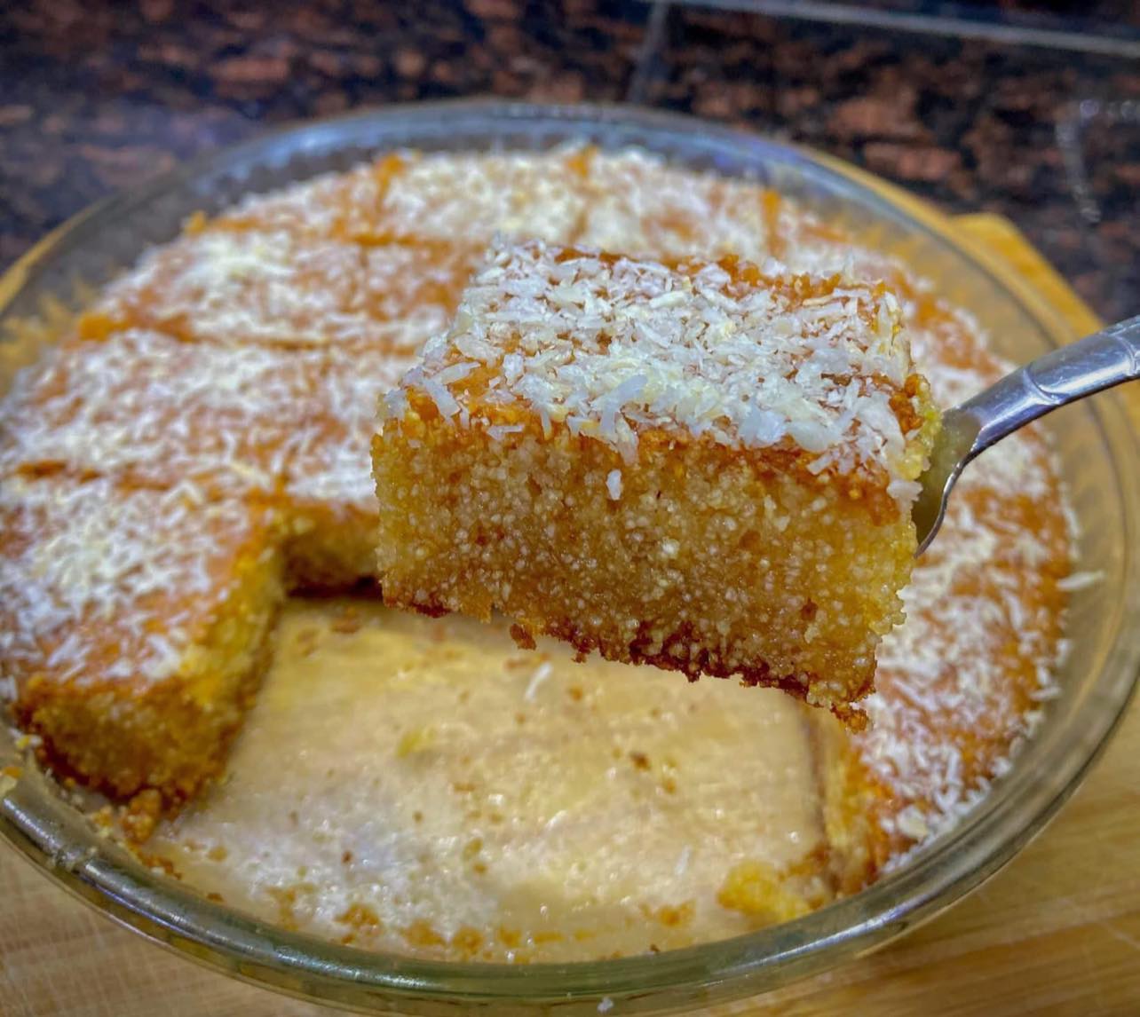 Ingrediënten: 2 kopjes bloem 1 kopje suiker 1/2 kopje gesmolten boter 4 eieren 2 theelepels vanille-extract 1/2 theelepel bakpoeder Zout naar smaak 1 kopje fijne griesmeel Slagroom (of crème fraîche) voor het serveren Gedroogd fruit (zoals amandelen of pistachenoten) ter decoratie Bereiding: