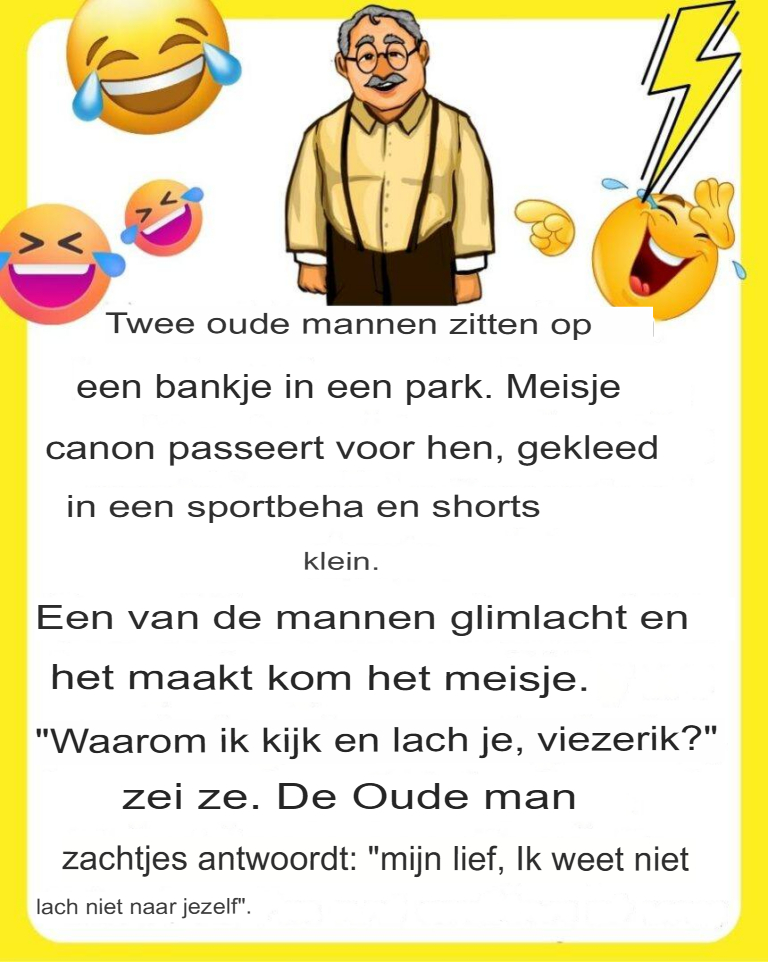 Twee oudere mannen zitten op een bankje in het park. Een knappe jonge vrouw rent voorbij in een sportbeha en een kort broekje. Een van de mannen glimlacht, en dat trekt de aandacht van de vrouw. « Waarom kijk je naar me en glimlach je, viezerik? » vraagt ze. De oude man antwoordt vriendelijk: