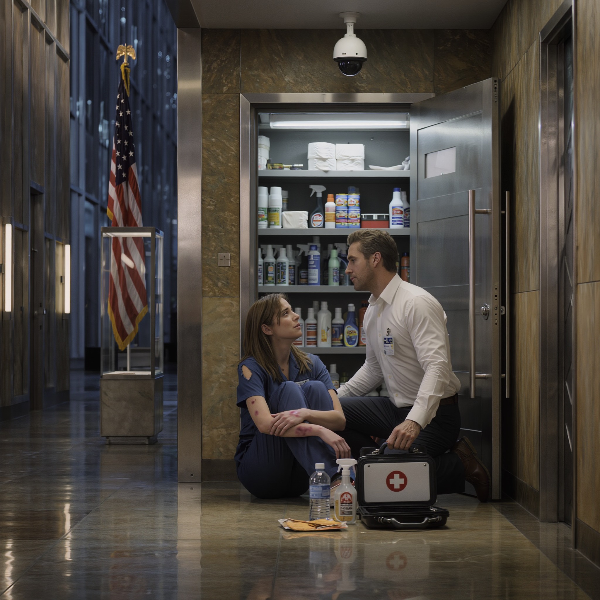 Ze zat op de vloer van de voorraadkast, met haar rug tegen een schap vol schoonmaakmiddelen. Haar uniform – marineblauw met het logo van het gebouw op de borst – was bij de schouder gescheurd. Haar donkere haar, in een paardenstaart gebonden, was losgeraakt.