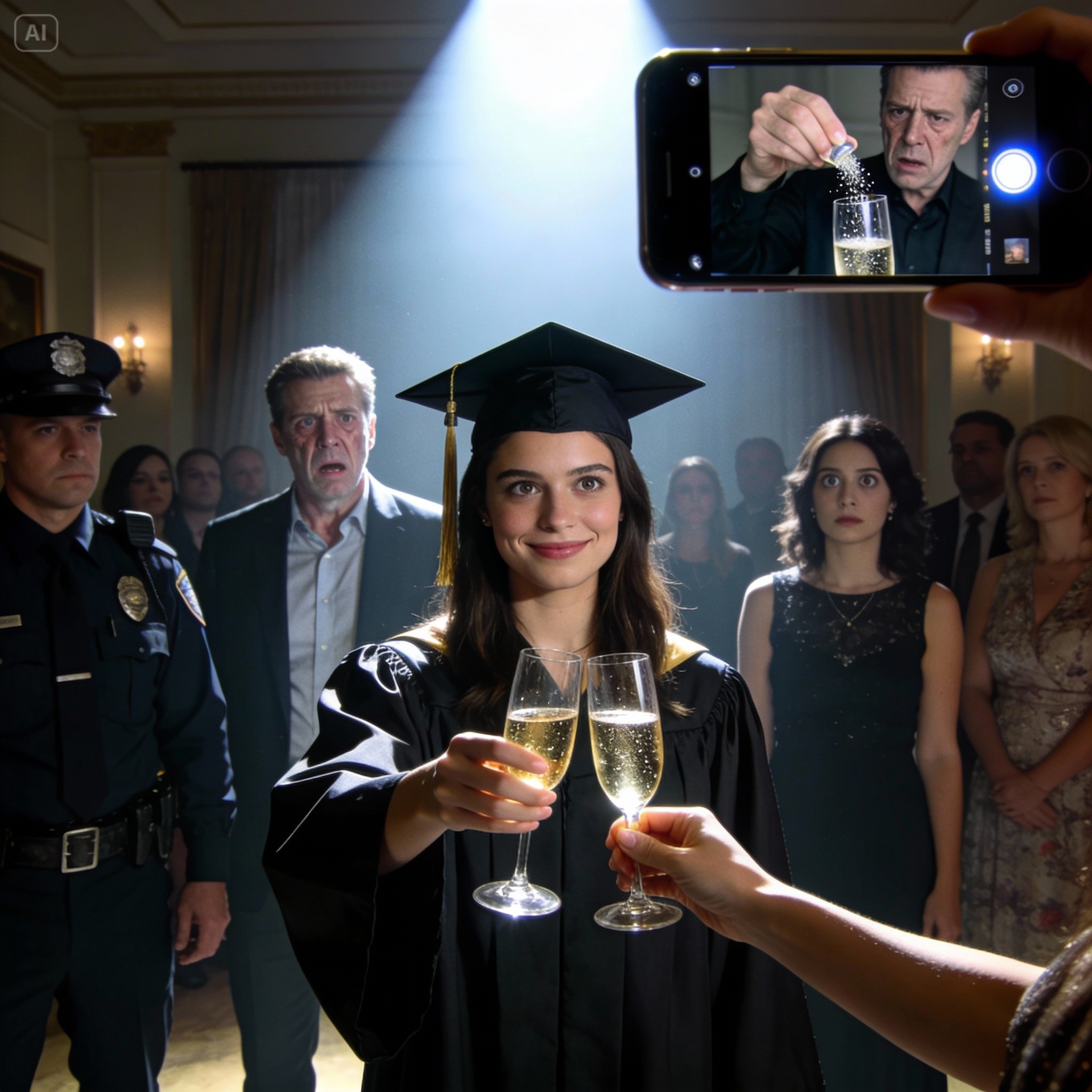 Op mijn afstudeerfeest merkte ik dat mijn vader stiekem iets in mijn glas champagne deed. Ik glimlachte, stond op en verwisselde nonchalant de glazen, waarna ik het glas aan mijn zus gaf om te zien wat er zou gebeuren. Ze aarzelde en dronk niet. De hele zaal werd stil. Toen ik de beveiliging belde en de video afspeelde die ik had opgenomen… werd het complot tegen mij onthuld. En dat was nog maar het begin.