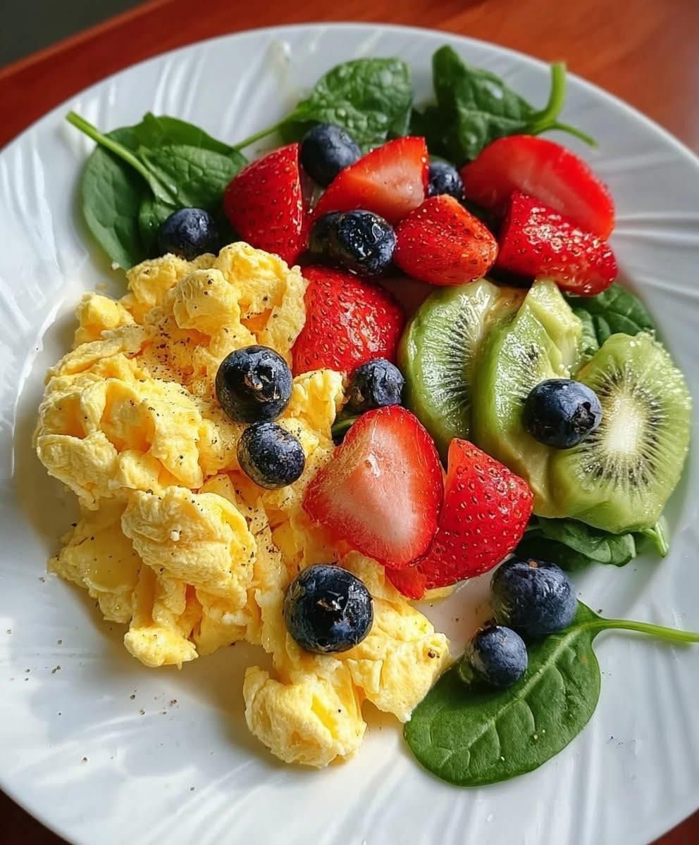 Een levendig, voedzaam ontbijt vol kleur en frisheid: romige roereieren geserveerd met avocado, tomaten, spinazie en een mix van zoet fruit voor een evenwichtige en energieke start van de dag!